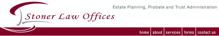 Stoner Law Offices is committed to providing personalized estate planning advice and professional assistance with every phase of the estate administration and estate settlement process. My key practice areas are Estate Planning, Probate, and Estate and Trust Administration. Everyone will need my services for planning for their life time financial well being, as well as for the control over the use and enjoyment of the transfer of wealth after death. As a legacy planning specialist I am dedicated to being attentive and responsive to the clients needs, personal goals and objectives. I am available to speak to groups about the need for Wills, Powers of Attorney, Living Wills, Trust Accounts and the Probate Process. There is an art to creating generational wealth and I would welcome an opportunity to assist you with utilizing the tools that were designed to create the legacy of your choice. Planning is Important!Please contact me to schedule an appointment: Stoner Law Offices |